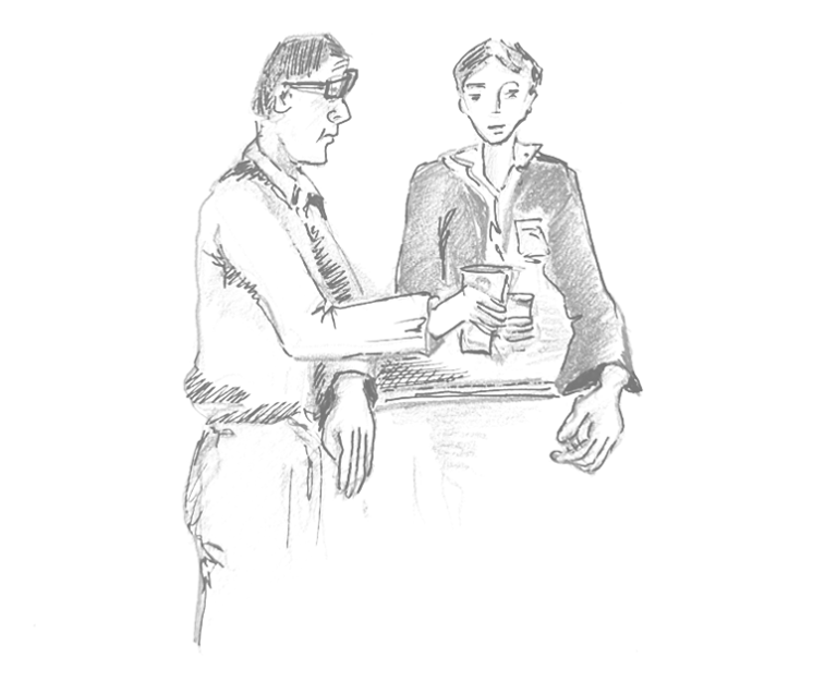تاوهکوو گهیشتینه بهردهم هۆڵی خراخت، فرانک هیچی نهگوت. لهبهردهم هۆڵهکهدا سڵهمییهوه و به دهنگێکی بهرز گوتی: “دهڵێم کاتمان لهپێشه، با له جێگایهک بیرهیهک یان پێکێک شهراب بخۆینهوه!”